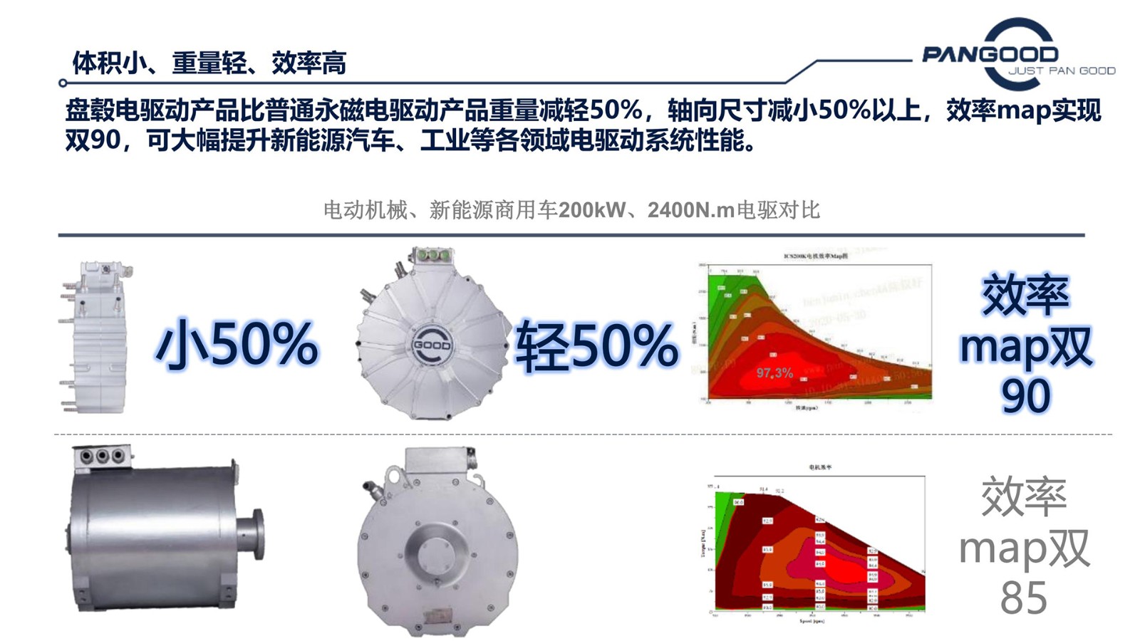 盘毂电驱动产品比普通永磁电驱动产品重量减轻50%,轴向尺寸减小50%以上,效率map实现双90,可大幅提升新能源汽车、工业等各领域电驱动系统性能。
